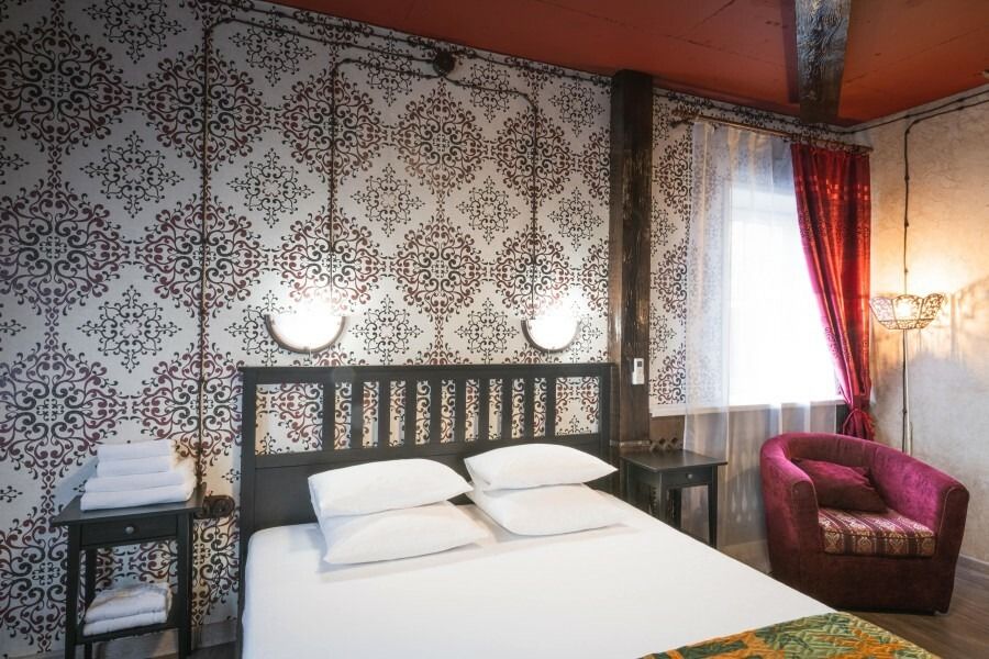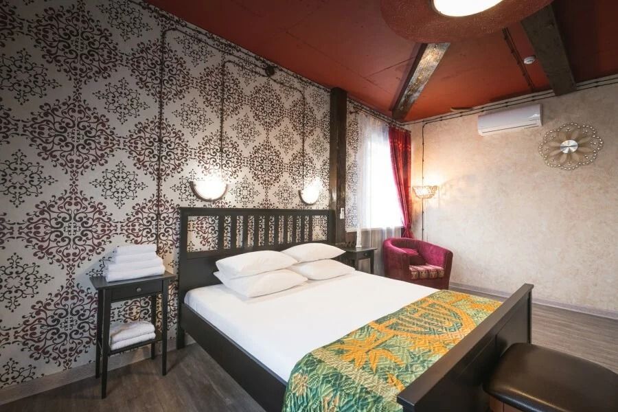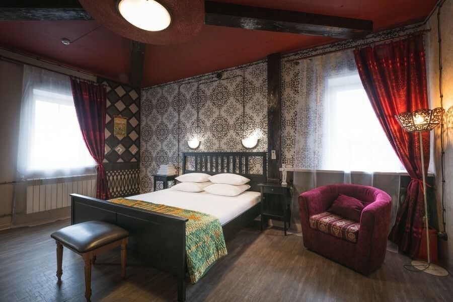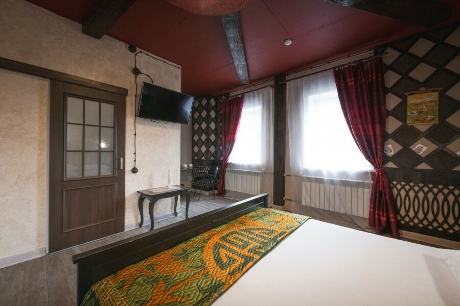 Просторный двухместный номер, напоминающий монгольскую юрту. В номере в балансе сочетаются оттенки бежевого, коричневого и акцентного красного. Именно красный цвет в традиционном монгольском мировосприятии связан с понятиями домашнего очага, радости, полноты жизни, красоты и богатства. Кроме того, традиционный монгольский стиль в интерьере поддержан использованием большого количества дерева благородных оттенков - мебель, балки на потолке, панно на стенах, пол из досок сибирской сосны.