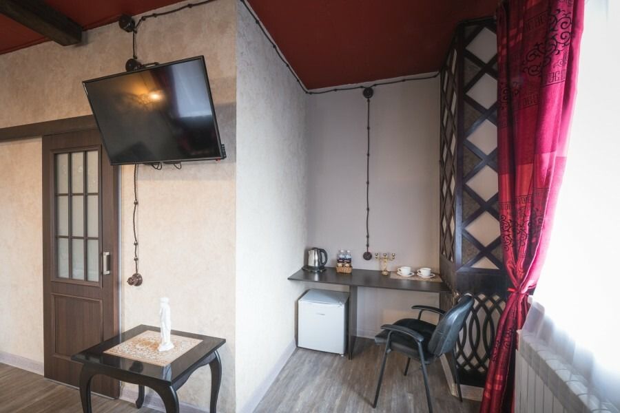 В номере есть все необходимое для комфортного проживания: широкая кровать с матрасом повышенной комфортности, 4 подушки, большой и удобный шкаф, кресло, телевизор, обеденная зона, столик, чайник, холодильник, просторная ванная комната с феном и принадлежностями.