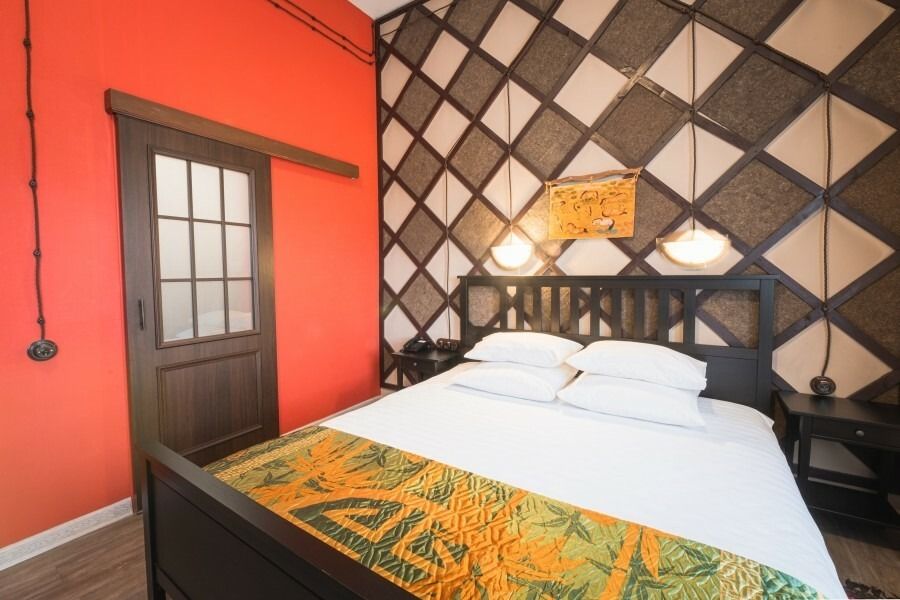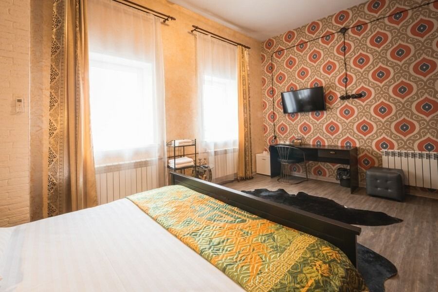 Просторный двухместный номер с элементами традиционного монгольского стиля в интерьере. В номере в балансе сочетаются природные бежевые и коричневые оттенки, а также акцентные ярко-красные, синие и желтые цвета. В традиционном монгольском мировосприятии красный цвет связан с понятиями огня, красоты и богатства, желтый ассоциируется с застывшим солнечным светом, переливающимся золотом, а синий цвет символизирует чистоту, верность и благородство. Традиционный монгольский стиль в интерьере также проявляется в использовании большого количества дерева - мебель, двери, панно на стенах, пол из сосновых досок. Интересными деталями в номере являются удобное кресло-качалка из натурального дерева и ковер, по форме напоминающий шкуру животного, убитого монгольским кочевником.